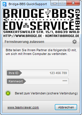 Wie die meisten Dienstleister verwendet auch Bridge-BBS Internet-Service das Fernwartungstool "TEAMVIEWER". Hierür haben wir für Sie den Teamviewer QuickConnect vorkonfiguriert. Mit wenigen Klicks können Sie Kontakt mit uns aufnehmen. Dann können wir Ihnen auch helfen ohne persönlich zu Ihnen kommen zu müssen. Mit Teamviewer lernen Sie schnelle und kompetente Hilfe kennen.