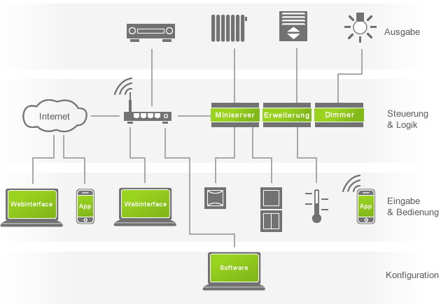Im Loxone Smart Home wird alles in einem zentralen intelligenten Herzstück, dem kleinen grünen Miniserver, zusammengefasst. Keine Insellösungen mehr. Gewöhnliche Taster und simple Steuerelemente werden genauso in das System integriert wie Photovoltaikanlagen und andere komplexe Systeme.